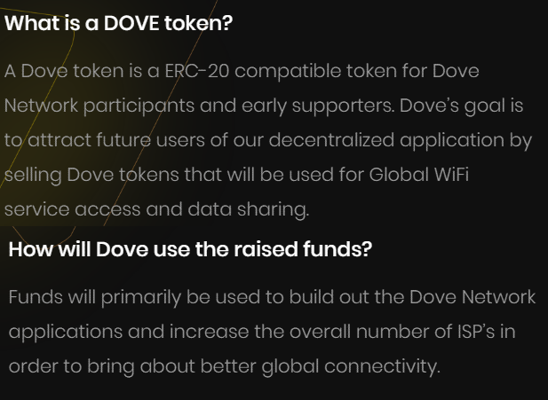 3. Due to the fact, that all data are stored in public blockchain, someone can try to found out who and how much earns within the public blockchain, or even try to track the location of the hotspot owner and steal money. According to Dove Network, the project developers are still conducting research on this task. But they have already found a way out. It is to provide user with an opportunity to participate in a private blockchain, that will increase the performance.